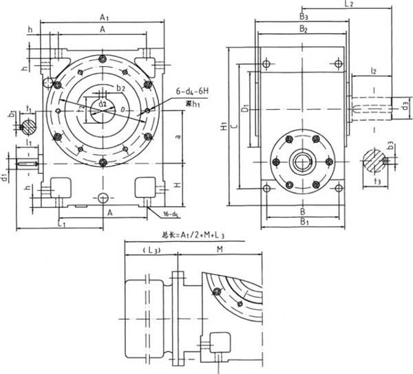 輸入軸為單出軸型多面安裝軸裝式圓弧圓柱蝸桿減速器,中心距a=200mm,傳動比i=10,第六種裝配型式。