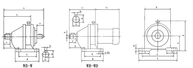 a、單級減速比機型有WB65型、WB85型、WB100型、WB120型、WB150型。其減速比分別有9、11、17、23、29、35、43、59、71、87。