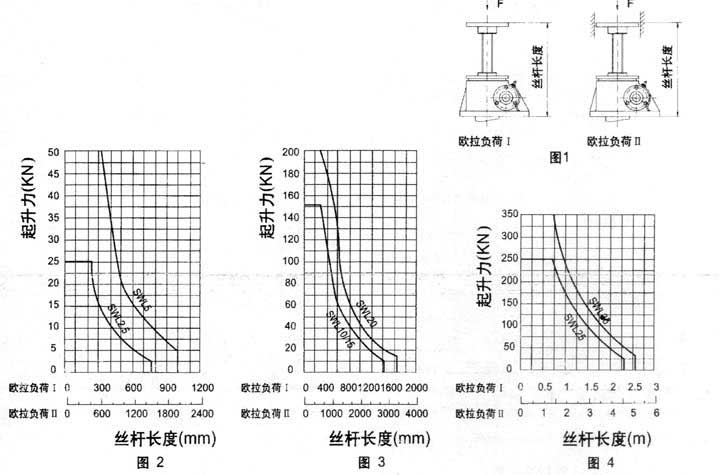 根據絲桿行程和提升負荷查圖1~圖4,找出所需升降機的型號。再查提升力和提升速度表,校核提升速度是否滿足要求。